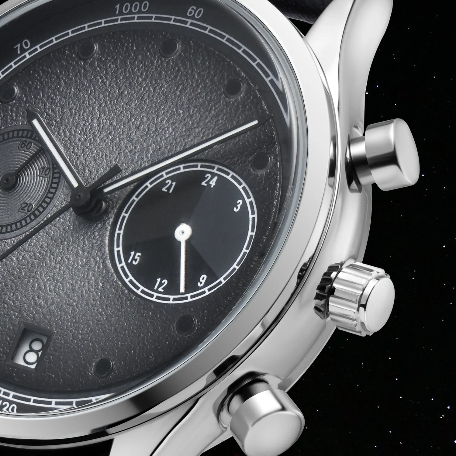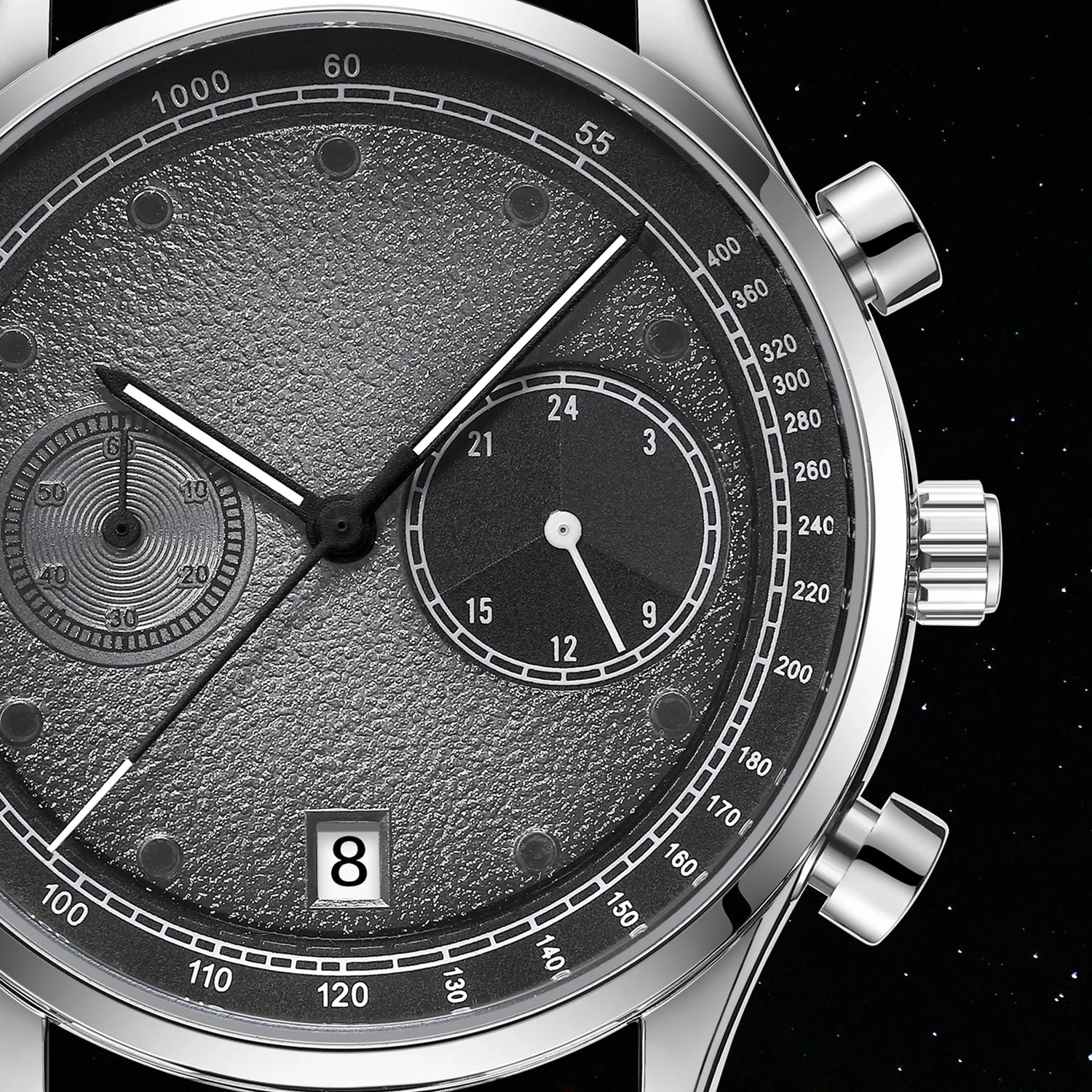 This designer watch features a unique dual-layer dial. The base dial is sandblasted to mimic the raw, pitted surface of a meteorite, while the deep black sub-dials add to its celestial feel. This makes it a truly nice watch and a stylish choice for any occasion.