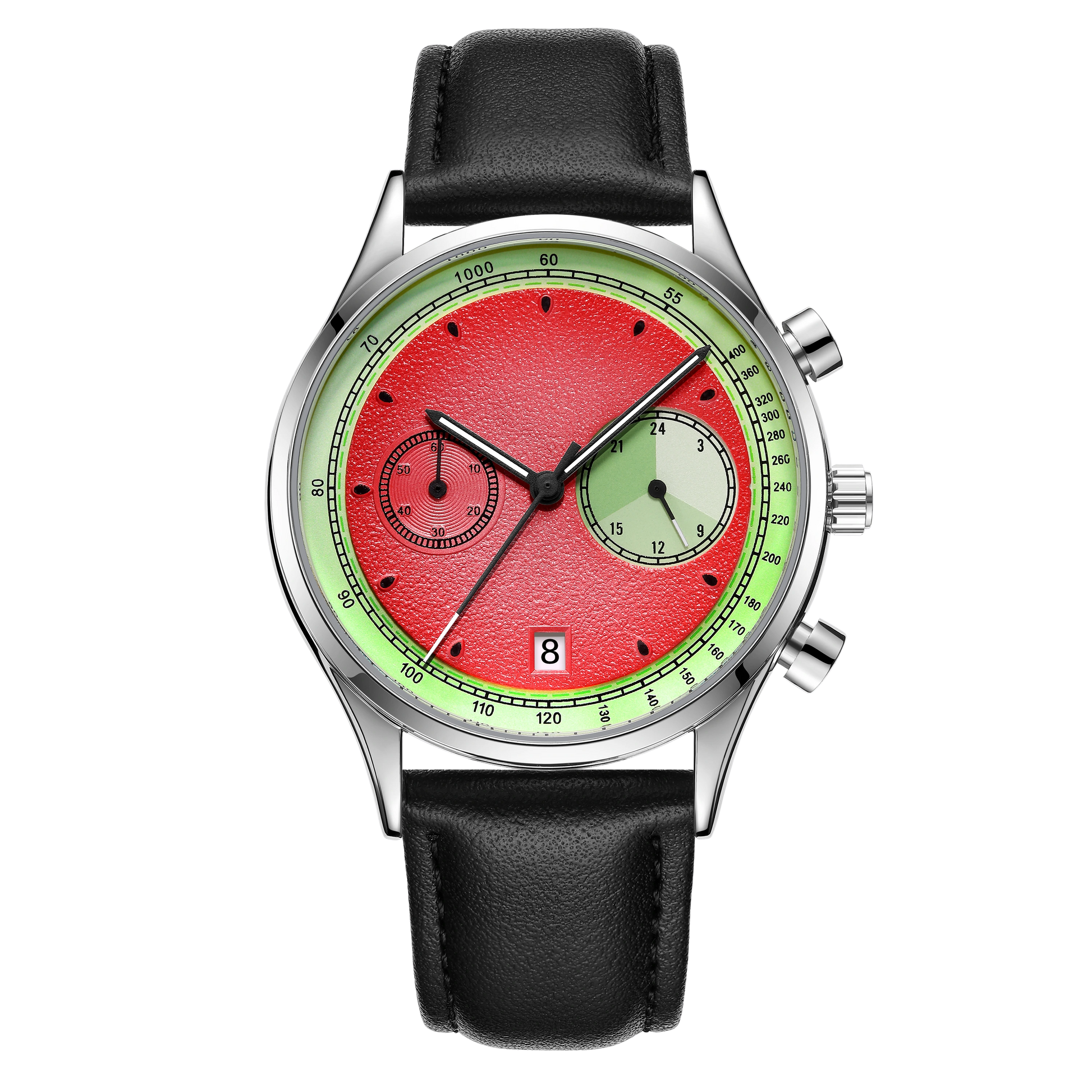 This vibrant chronograph watch is for those who love unique style. Inspired by the refreshing spirit of a watermelon, it offers unconventional elegance that sets it apart from typical watch brands. It’s the perfect blend of fun and function, making it an ideal choice for anyone looking for a cool watch that stands out. This is a truly nice watch for every wrist.