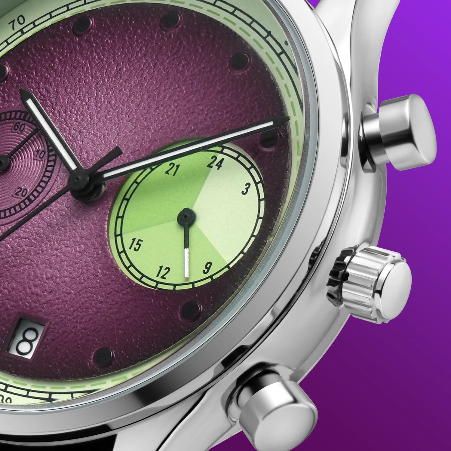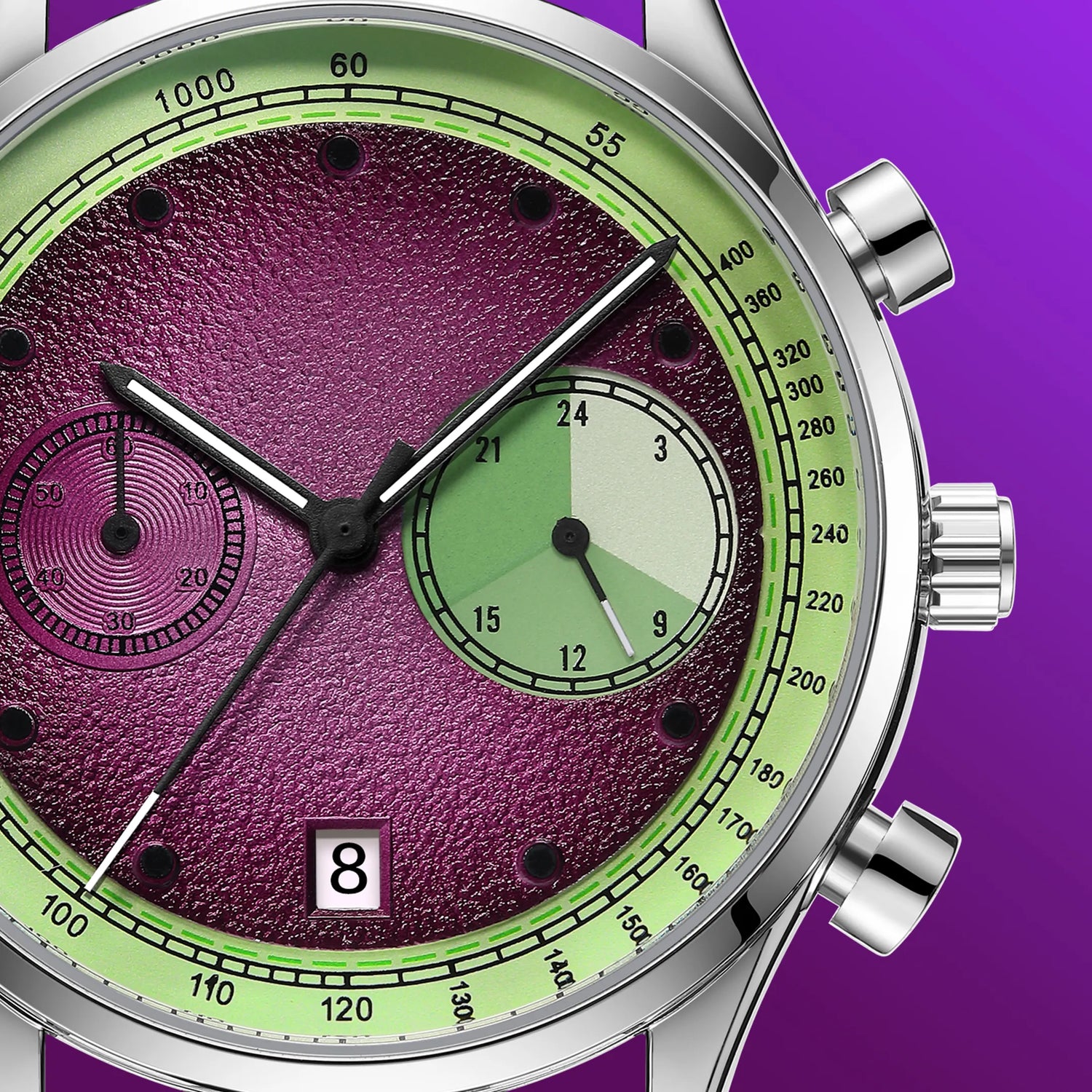 This designer watch features a unique dual-layer dial. The base dial is sandblasted to mimic the vibrant, textured skin of an eggplant, while the light green sub-dial adds a striking contrast. This makes it a truly nice watch and a stylish choice for any occasion.
